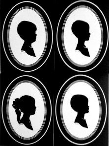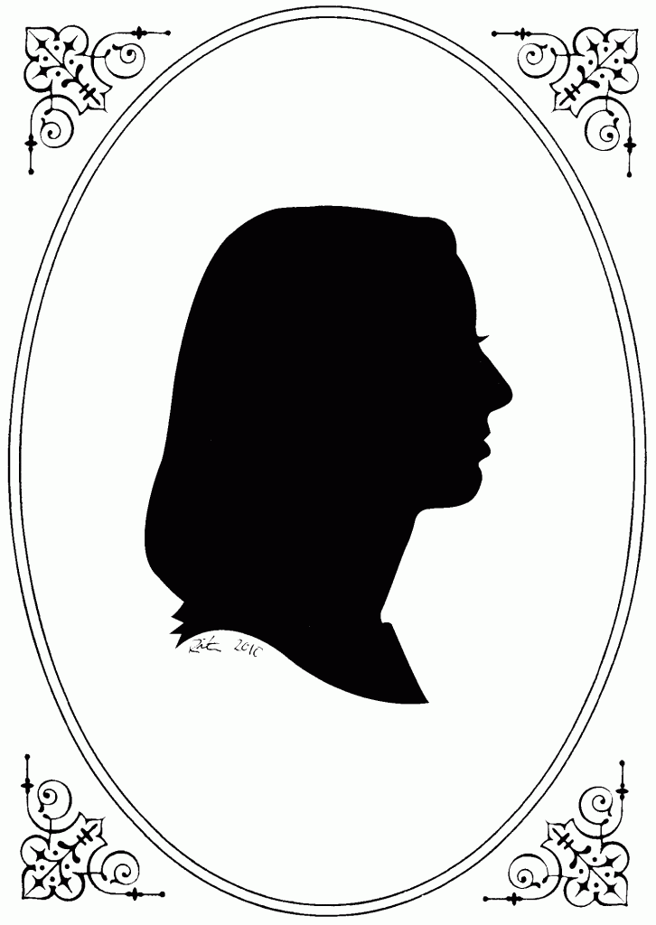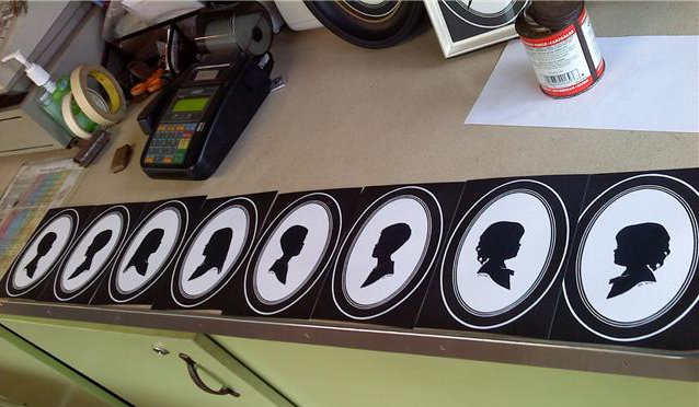 Hand-cut silhouettes by Rita. Cut out of paper with scissors. Each created quickly in about 5-10 minutes. Makes a wonderful keepsake that many people continue to get done as a family tradition.