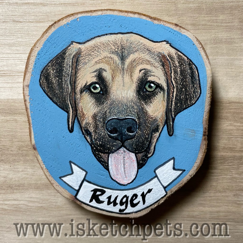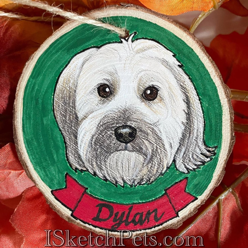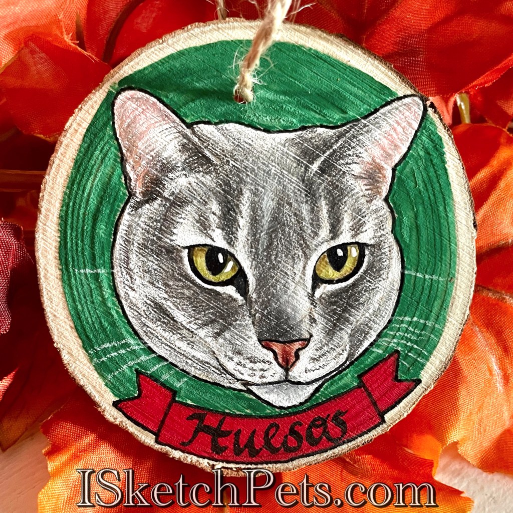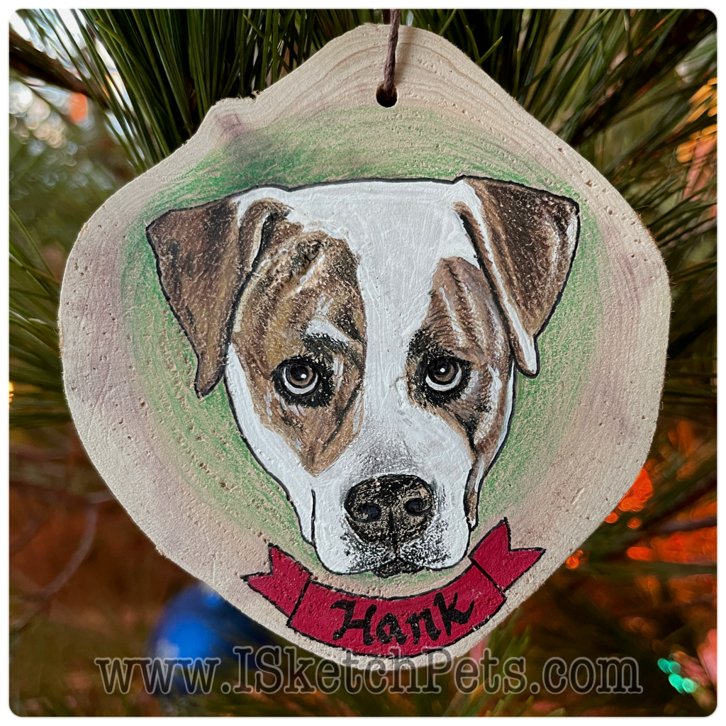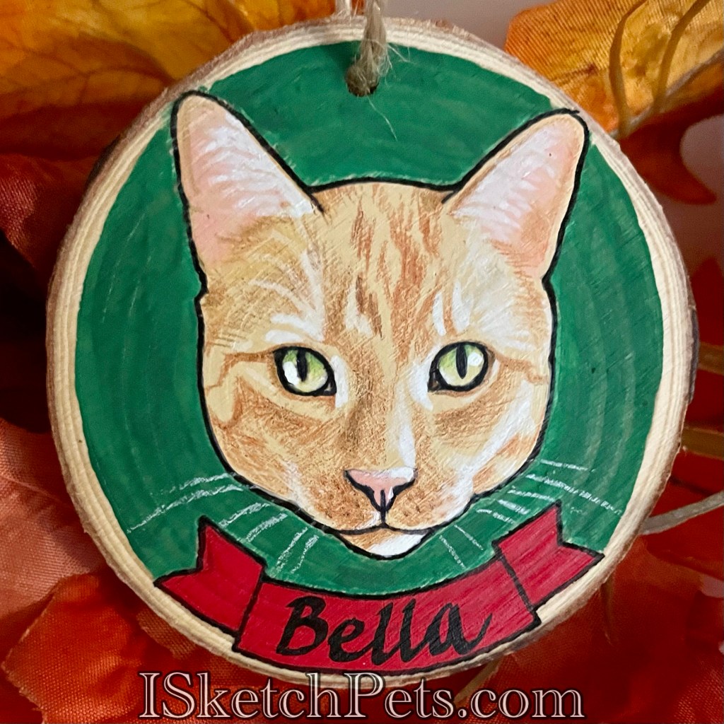 These pet portraits are drawn with colored pencils, acrylic paint and permanent marker on a wooden slab. They are about 3-3.5 inches in diameter. Can be made into an ornament with hole and string or magnet on back.