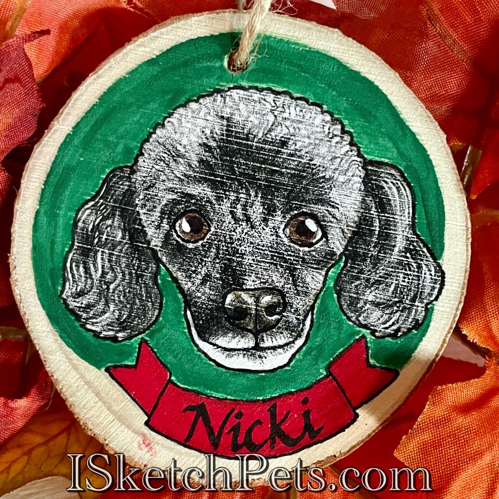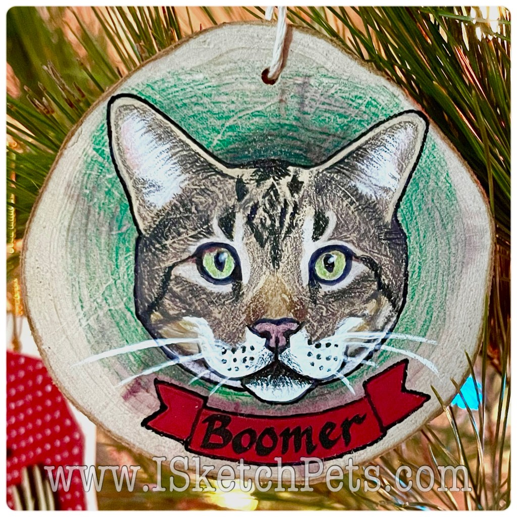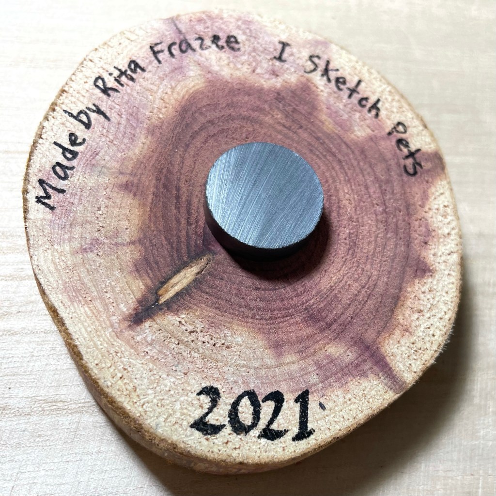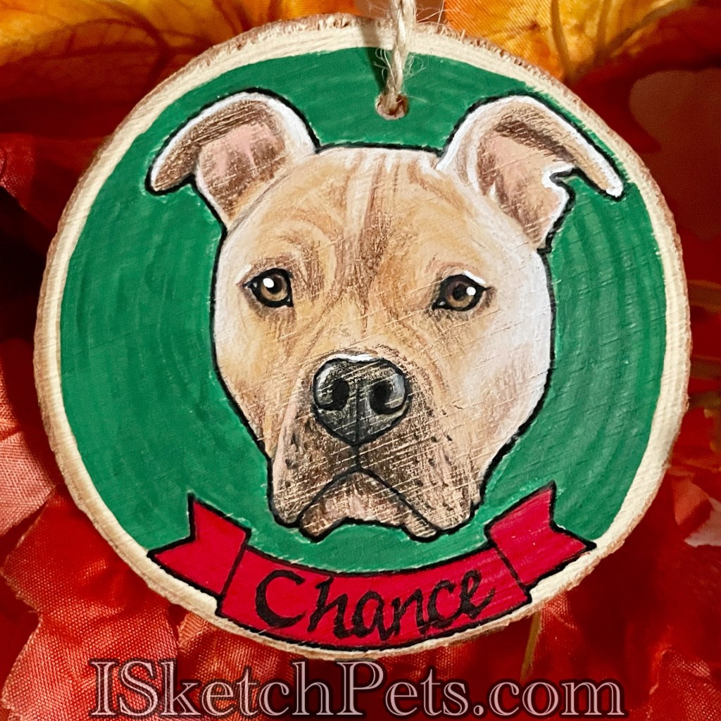 These pet portraits are drawn with colored pencils, acrylic paint and permanent marker on a wooden slab. They are about 3-3.5 inches in diameter. Can be made into an ornament with hole and string or magnet on back.