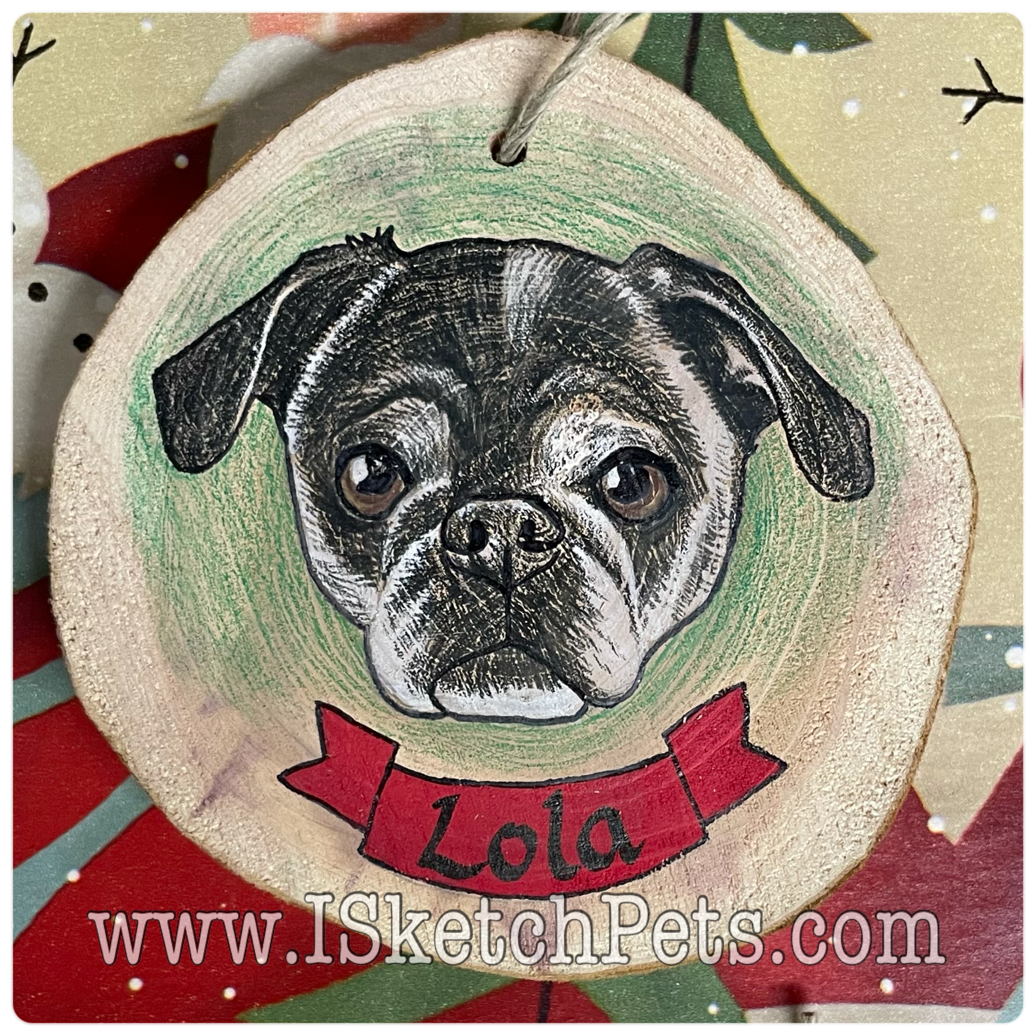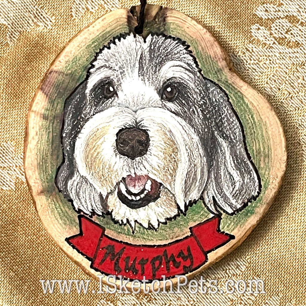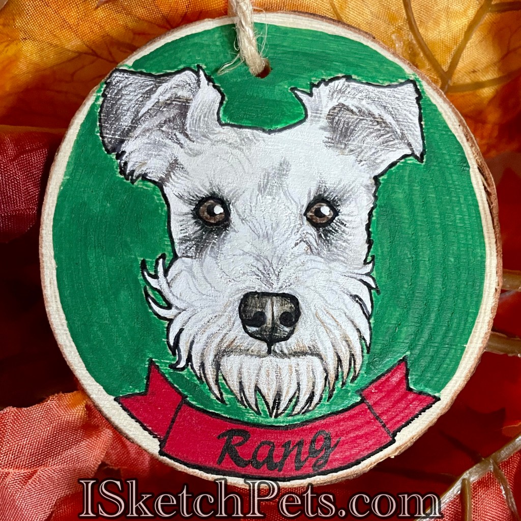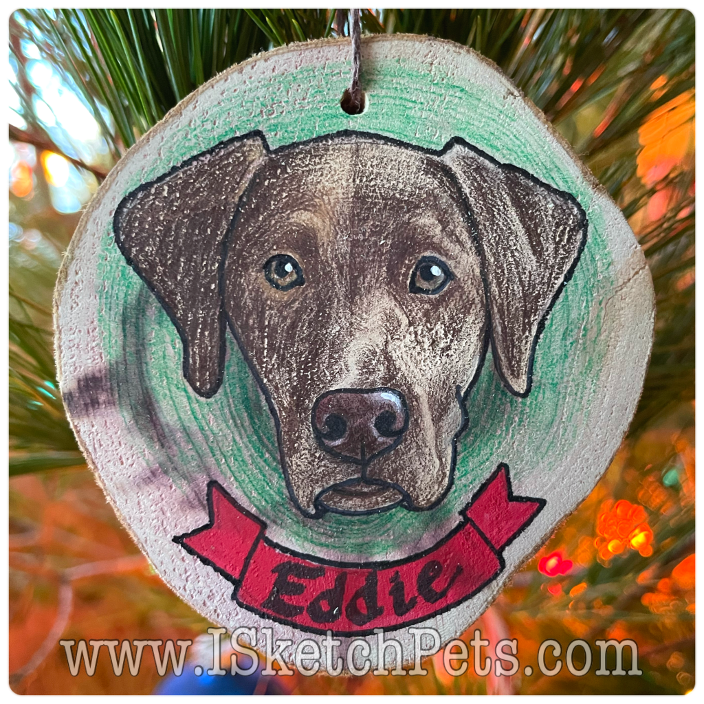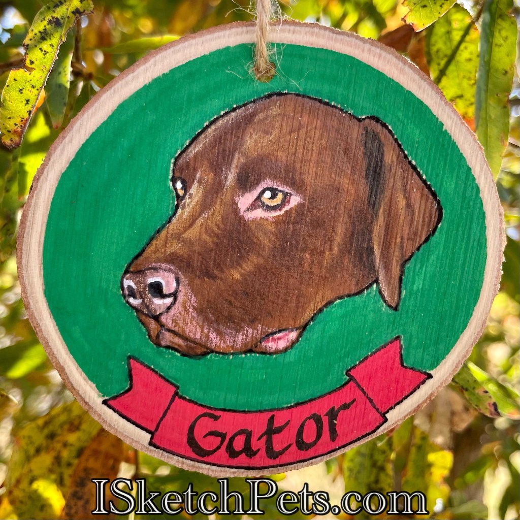 These pet portraits are drawn with colored pencils, acrylic paint and permanent marker on a wooden slab. They are about 3-3.5 inches in diameter. Can be made into an ornament with hole and string or magnet on back.