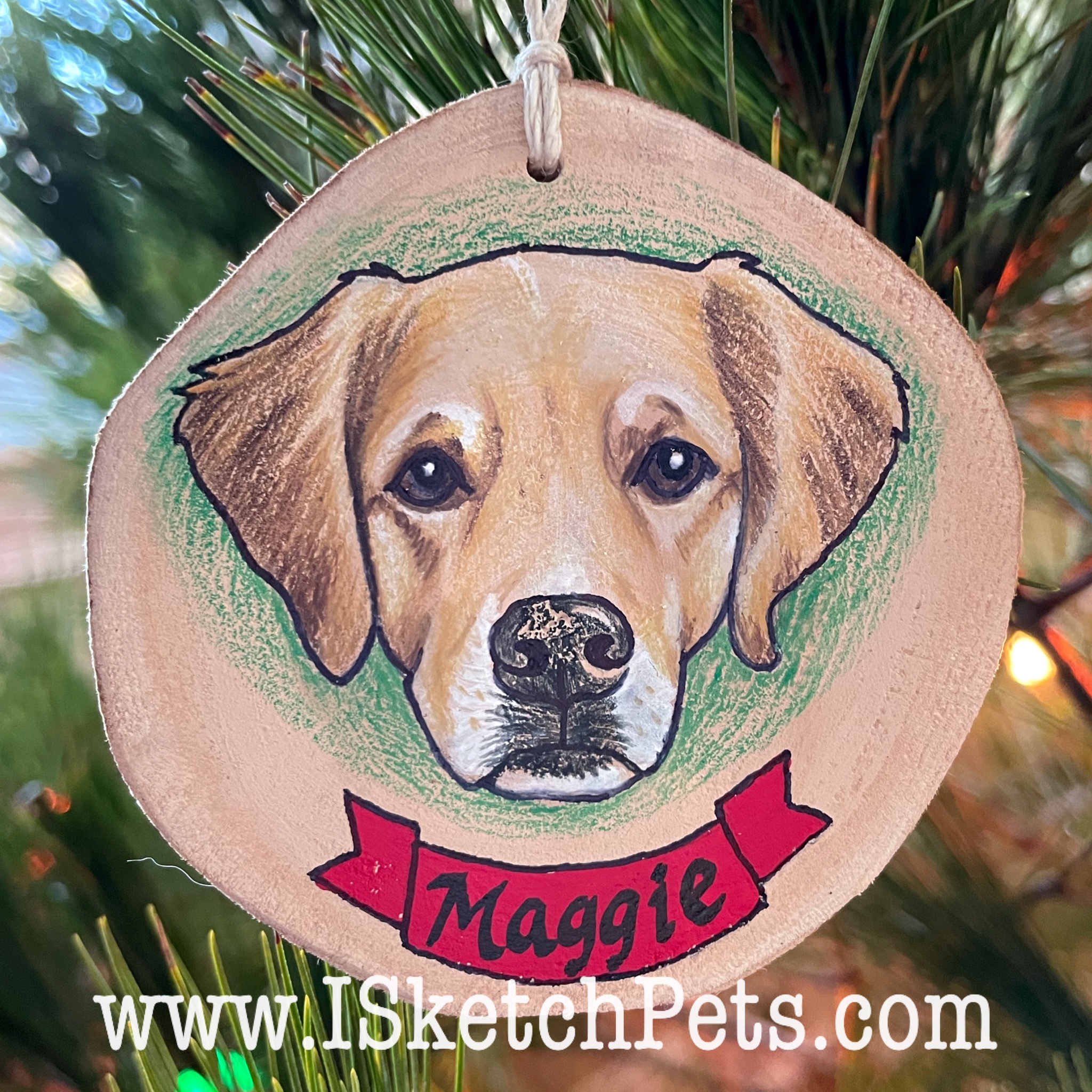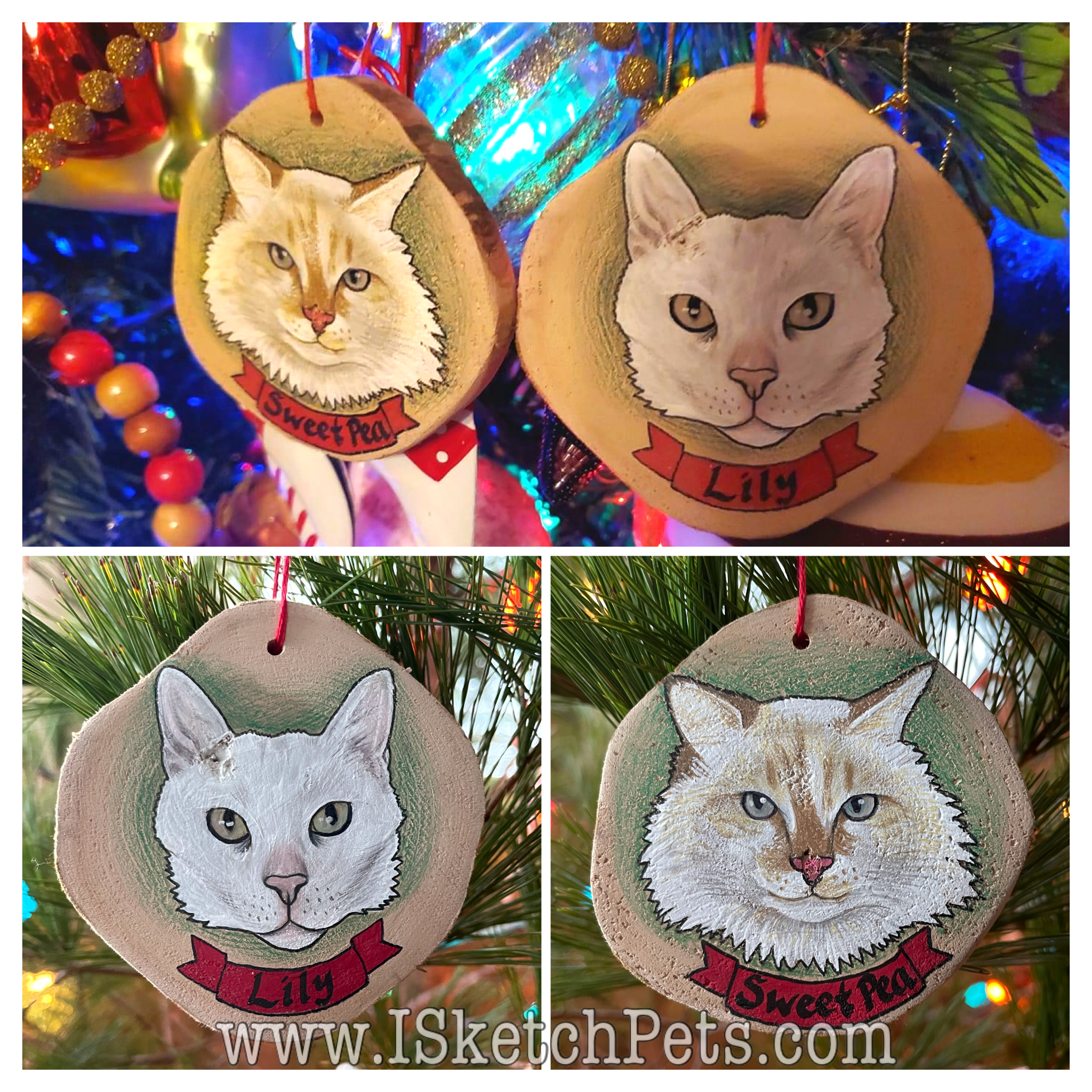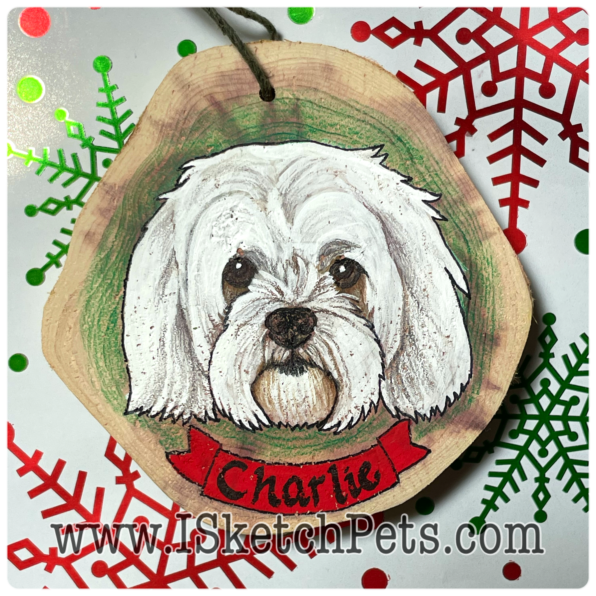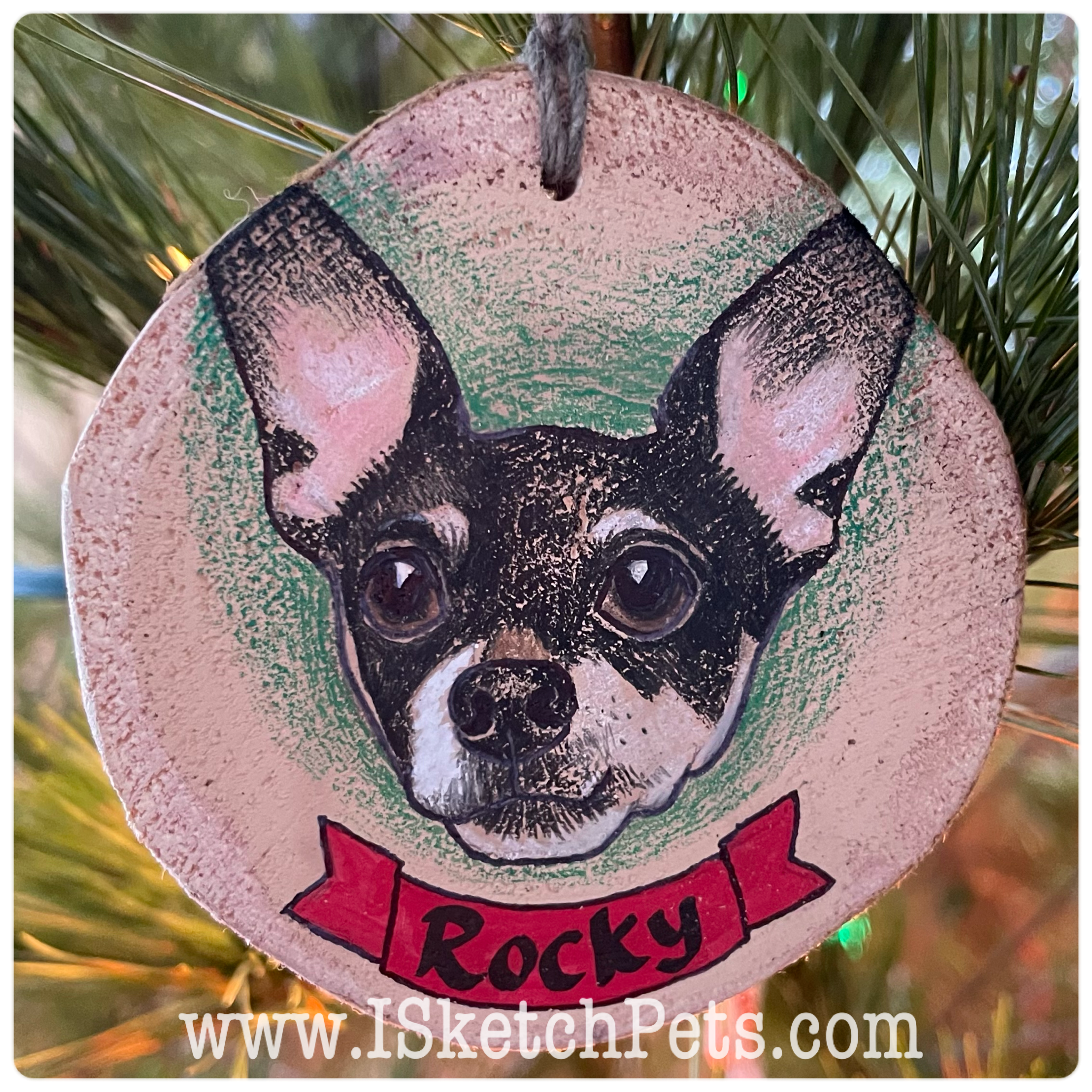 These pet portraits are drawn with colored pencils, acrylic paint and permanent marker on a wooden slab. They are about 3-3.5 inches in diameter. Can be made into an ornament with hole and string or magnet on back.